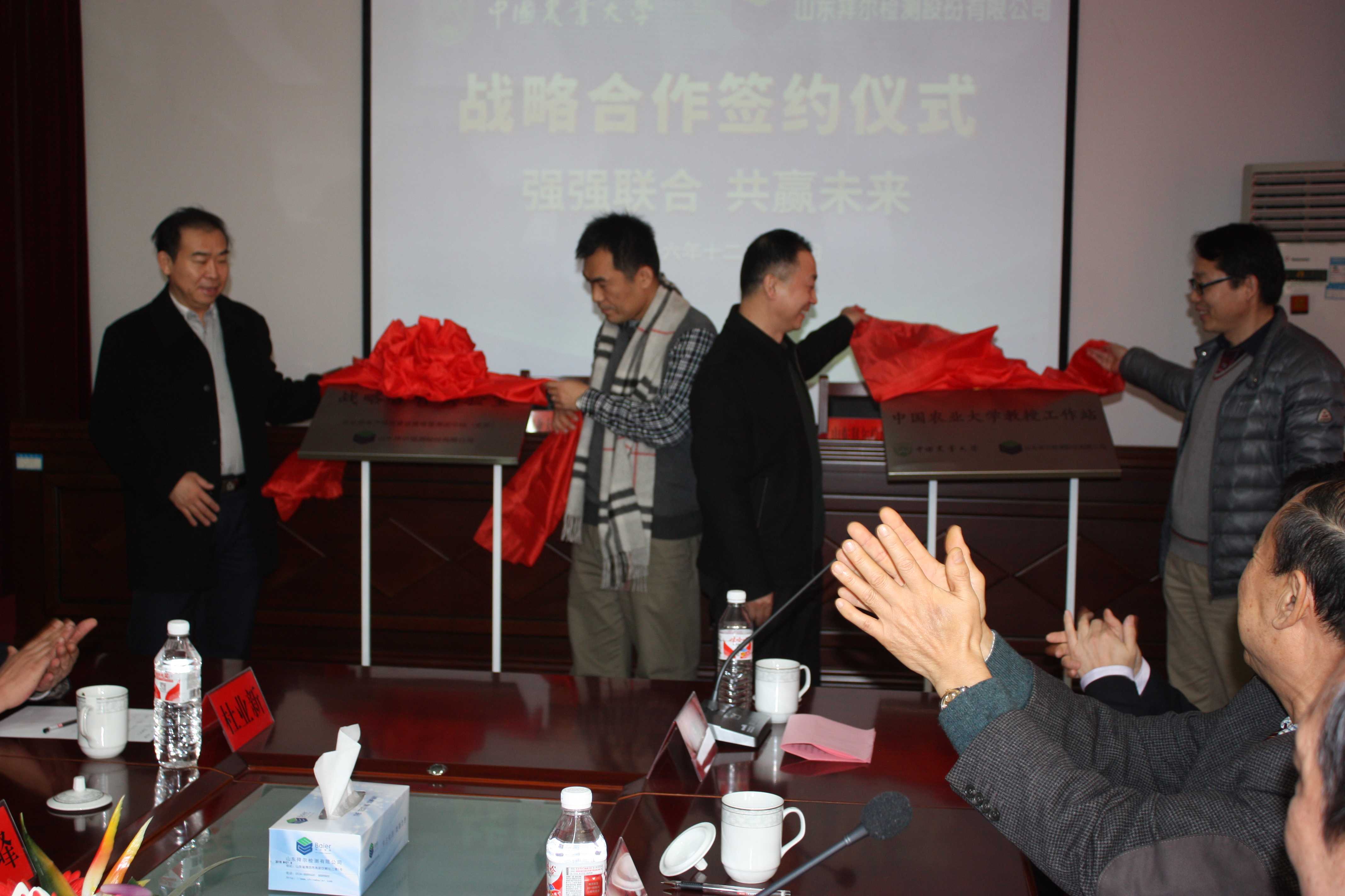 在欢快的气氛中,胡文星主任与中国农业大学许文涛教授、潍坊高新区经济发展局孙文峰局长与中国农业大学翟百强教授分别为“中国农业大学教授工作站”及“战略合作实验室”揭牌。